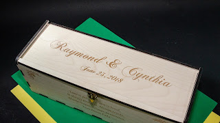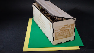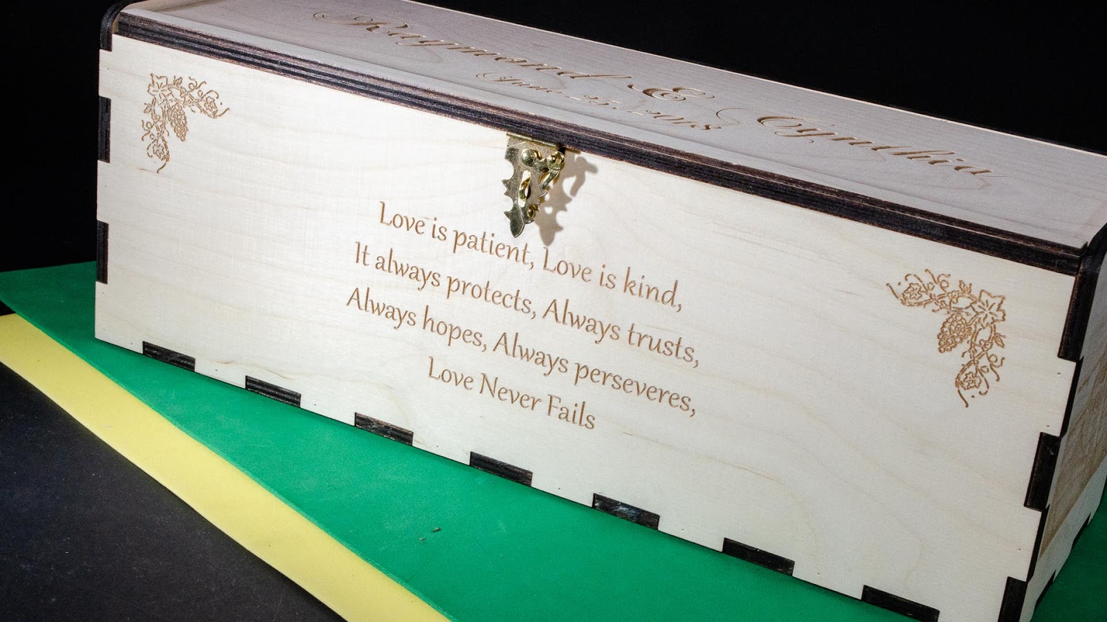 | Wood tab type of hinge, Lasered content on each end of gift box. |